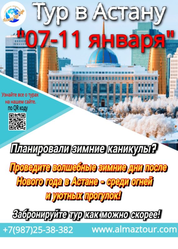 3 день. 08.00 Завтрак. 09:00 Начало обзорной экскурсии по центру города, продолжение экскурсии по старой части города, которая охватывает правый и левый берега, архитектуру трех эпох (Акмолинск, Целиноград и Астана). Памятники основателям Казахского ханства и последнего казахского хана с выходом для фотографий. Посещение Байтерек Символ Астаны и Казахстана, 97 метровая башня с шаром наверху (доп. плата). Увидим Правительственный квартал, Спортивный кластер (стадионы), Корейский сад дружбы, национальный космический центр с макетами ракет в натуральную величин, набережная реки Ишим. 13:30 Обед в гостинице.