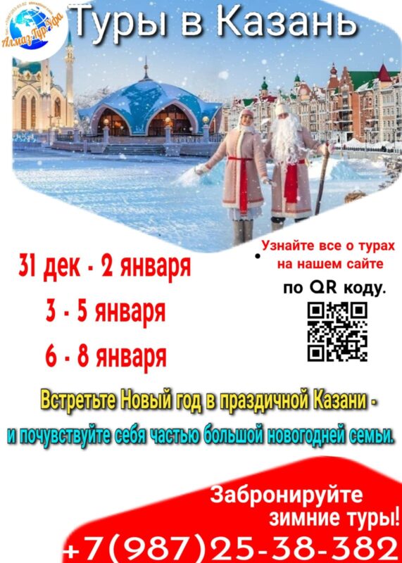 05:00: (по уфимскому времени): Сбор и отъезд группы в Казань.11:00 — 12:00: (по московскому времени): Прибытие в Казань. Заселение в гостиницу. Обед.13:30 — 16:30: Автобусная обзорная экскурсия по городу. Вы посетите: улицы Кремлевскую, Булак, ул. Петербургскую, Старо-татарскую слободу, мечети «Азимовскую» или «Марджани», парк 1000-летия Казани, Крестовоздвиженскую церковь с Казанской иконой Божьей Матери, Собор Петра и Павла и т.д.17:00 — 21:00: Есть возможность посетить один из крупнейших аквапарков «Ривьера», театров, спорткомплексов. (предоставляется автобус группе). Свободное время.