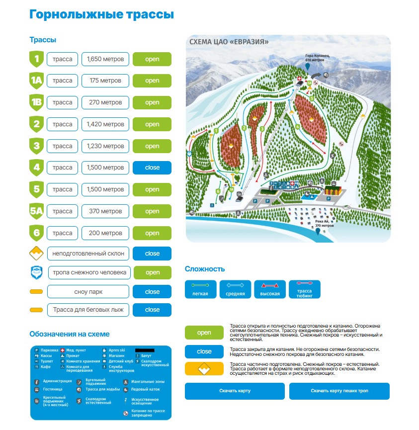 — 8 трасс различной степени сложности (длиной до 1 650 м), общей протяженностью 7,8 км, перепад высот 350 м;